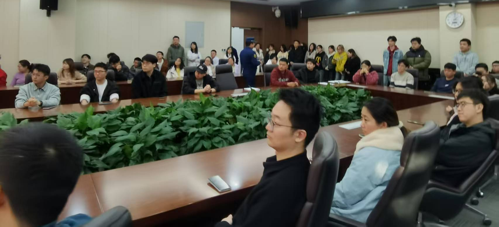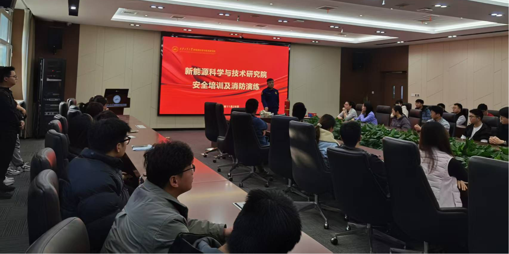 为了增强新能源科学与技术研究院全体师生的安全防范意识,提升应对突发火灾的应急处置和自救互救能力,筑牢安全防线,研究院特邀请校保卫处郭园华等3位老师,于2025年11月28日下午15:00~16:30,在教5-111会议室和114教室,对研究院全体师生共计119人,其中老师33人,学生86人,进行了安全培训,并组织全体师生参加了消防应急演练。